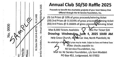 The 2025 50/50 raffle drawing was held on June 4, 2025 at 10:00 A.M. at Church of the Holy Cross, 40 Mercer Avenue, North Plainfield, NJ. The drawing was recorded and will be available to club members. You can request to view the recording by sending an email to
