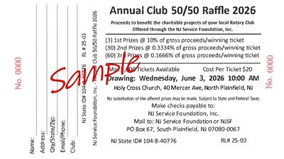 The 2026 50/50 raffle drawing will be held on June 3, 2026 at 10:00 A.M. at Church of the Holy Cross, 40 Mercer Avenue, North Plainfield, NJ. The drawing will be recorded and will be available to club members. You can request to view the recording by sending an email to